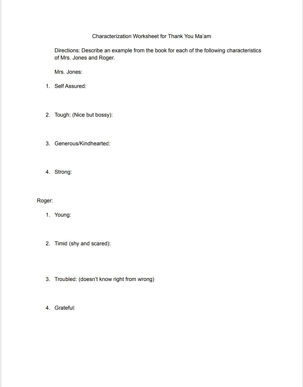 Ĉ, thank you mam worksheets.doc She takes him home where she lets him wash up and feeds him dinner. This is a worksheet and key for the short story . "thank you ma'am" comprehension questions. She was a large woman with a large purse that had everything in it but hammer and nails.